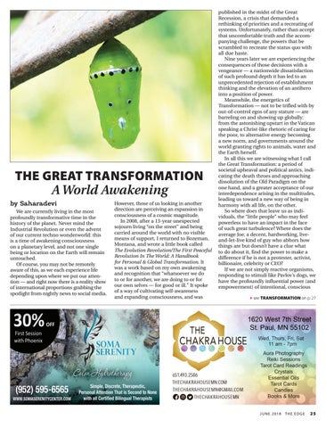 published in the midst of the Great Recession, a crisis that demanded a rethinking of priorities and a recreating of systems. Unfortunately, rather than accept that uncomfortable truth and the accompanying challenge, the powers that be scrambled to recreate the status quo with all due haste. Nine years later we are experiencing the consequences of those decisions with a vengeance — a nationwide dissatisfaction of such profound depth it has led to an unprecedented rejection of establishment thinking and the elevation of an antihero into a position of power. Meanwhile, the energetics of Transformation — not to be trifled with by out-of-control egos of any stature — are barreling on and showing up globally: from the astonishing upstart in the Vatican speaking a Christ-like rhetoric of caring for the poor, to alternative energy becoming a new norm, and governments around the world granting rights to animals, water and the Earth herself. In all this we are witnessing what I call the Great Transformation: a period of societal upheaval and political antics, indicating the death throes and approaching dissolution of the Old Paradigm on the one hand, and a greater acceptance of our interdependence arising in the multitudes, leading us toward a new way of being in harmony with all life, on the other. So where does that leave us as individuals, the “little people” who may feel powerless to have an impact in the face of such great turbulence? Where does the average Joe, a decent, hardworking, liveand-let-live kind of guy who abhors how things are but doesn’t have a clue what to do about it, find the power to make a difference if he is not a protester, activist, billionaire, celebrity or CEO? If we are not simply reactive organisms, responding to stimuli like Pavlov’s dogs, we have the profoundly influential power (and empowerment) of intentional, conscious see TRANSFORMATION on p. 27