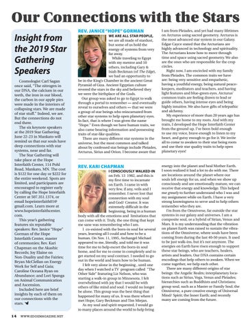 Our Connections with the Stars Insight from the 2019 Star Gathering Speakers Cosmologist Carl Sagan once said, “The nitrogen in our DNA, the calcium in our teeth, the iron in our blood, the carbon in our apple pies were made in the interiors of collapsing stars. We are made of star stuff.” Indeed, we are. But the connections do not end there. The six keynote speakers at the 2019 Star Gathering June 22-23 in Mankato will remind us that our souls have deep connections with star systems, near and far. The Star Gathering will take place at the Hope Interfaith Center, 114 Pohl Road, Mankato, MN. The cost is $122 for one day or $222 for the entire weekend. Spots are limited, and participants are encouraged to register early by calling the Hope Interfaith Center at 507.351.1374, or email hopeinterfaith01@ gmail.com. Learn more at www.hopeinterfaithcenter. com. This year’s gathering features six reputable speakers: Rev. Janice “Hope” Gorman of the Hope Interfaith Center, master of ceremonies; Rev. Kari Chapman on the Akashic Records; Joy Elaine on Non-Duality and the Fairies; Bryan McClellan on Energy Work for Self and Gaia; Caroline Oceana Ryan on Abundance; and Lori Spanga on Animal Communication and Ascension. Included here are brief insights by each of them on our connections with the stars. a