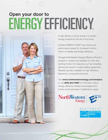 EnErgy EfficiEncy. A high efficiency home results in a smaller energy footprint for the life of the home. Certified ENERGY STARŽ new homes are performance-tested for increased comfort, indoor air quality and energy efficiency. Through NorthWestern Energy’s Efficiency Plus (E+) programs, rebates are available for new and existing homes for measures such as insulation, lighting and space or water-heating equipment. Rebates are also available for high efficiency televisions, computers and more. Visit www.northwesternenergy.com/nweplus or call (800) 823-5995 for information about energy efficiency rebates and programs for homes and businesses. Qualifications apply.