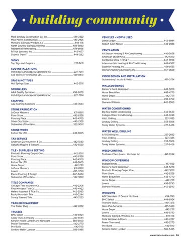 building community Mark Lindsay Construction Co. Inc................................................ 449-2322 Mike Melvin Construction................................................................. 443-2925 Montana Siding & Window, Co..........................................................449-1116 North Country Siding & Roofing .................................................. 459-9890 Residential Remodeling....................................................................459-6666 R-Tech Systems, Inc............................................................................ 443-4177 Strom’s Triple T ................................................................................... 449-1262