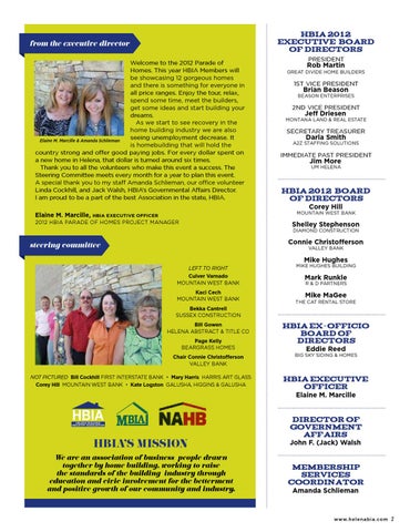 from the executive director Welcome to the 2012 Parade of Homes. This year HBIA Members will be showcasing 12 gorgeous homes and there is something for everyone in all price ranges. Enjoy the tour, relax, spend some time, meet the builders, get some ideas and start building your dreams. As we start to see recovery in the home building industry we are also seeing unemployment decrease. It Elaine M. Marcille & Amanda Schlieman is homebuilding that will hold the country strong and offer good paying jobs. For every dollar spent on a new home in Helena, that dollar is turned around six times. Thank you to all the volunteers who make this event a success. The Steering Committee meets every month for a year to plan this event. A special thank you to my staff Amanda Schlieman, our office volunteer Linda Cockhill, and Jack Walsh, HBIA’s Governmental Affairs Director. I am proud to be a part of the best Association in the state, HBIA.