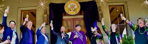 The celebration made its way to the Southern Hotel, where Grand Marshal Tim Lantrip, owner of The English Tea Room was welcomed and toasted by krewe members and supporters. The festivities continued with a champagne and king cake party, keeping the Carnival spirit alive ahead of the parade!