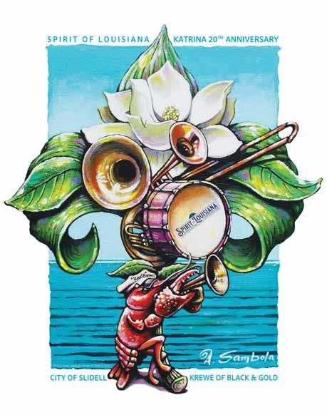 Doherty’s sculpture was originally featured in the 2015 “Hope for Habitat: Katrina X” exhibition. Sambola’s poster was commissioned for the “Spirit of Louisiana: Hurricane Katrina 20th Anniversary” commemorative events and featured in the Northshore Cultural Economy Coalition’s “Katrina: Then and Now” exhibition. Both the tenth and twentieth anniversary events were produced by Kim Bergeron, including art exhibitions hosted by the city in the Slidell Cultural Center.
