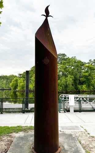 To mark the fifth anniversary of Hurricane Katrina, Doherty created “Fleur de Triomphe,” a 13-foot sculpture, created from a 24-inch diameter steel pipe, which now stands on the banks of Bayou Bonfouca in Slidell’s Heritage Park. The memorial is marked with a hurricane symbol and water line indicator at the seven-foot mark, and is topped with a fleur de lis. Dedicated on August 27, 2010, the sculpture is included in the Smithsonian American Art Museum’s Inventories of American Painting and Sculpture database.