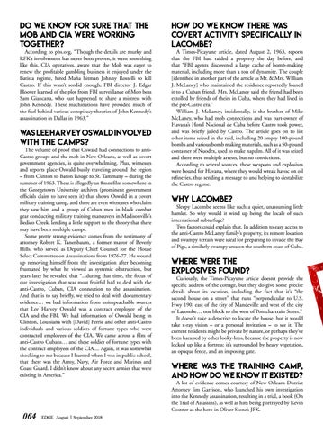 The volume of proof that Oswald had connections to antiCastro groups and the mob in New Orleans, as well as covert government agencies, is quite overwhelming. Plus, witnesses and reports place Oswald busily traveling around the region – from Clinton to Baton Rouge to St. Tammany – during the summer of 1963. There is allegedly an 8mm film somewhere in the Georgetown University archives (prominent government officials claim to have seen it) that shows Oswald in a covert military training camp, and there are even witnesses who claim they saw him and a group of Cuban men in black combat gear conducting military training maneuvers in Madisonville’s Bedico Creek, lending a little support to the theory that there may have been multiple camps. Some pretty strong evidence comes from the testimony of attorney Robert K. Tanenbaum, a former mayor of Beverly Hills, who served as Deputy Chief Counsel for the House Select Committee on Assassinations from 1976-77. He wound up removing himself from the investigation after becoming frustrated by what he viewed as systemic obstruction, but years later he revealed that “...during that time, the focus of our investigation that was most fruitful had to deal with the anti-Castro, Cuban, CIA connection to the assassination. And that is to say briefly, we tried to deal with documentary evidence… we had information from unimpeachable sources that Lee Harvey Oswald was a contract employee of the CIA and the FBI. We had information of Oswald being in Clinton, Louisiana with [David] Ferrie and other anti-Castro individuals and various soldiers of fortune types who were contracted employees of the CIA. We came across a film of anti-Castro Cubans… and these soldier of fortune types with the contract employees of the CIA.... Again, it was somewhat shocking to me because I learned when I was in public school, that there was the Army, Navy, Air Force and Marines and Coast Guard. I didn’t know about any secret armies that were existing in America.”