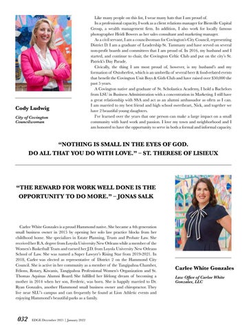 Like many people on this list, I wear many hats that I am proud of. In a professional capacity, I work as a client relations manager for Bienville Capital Group, a wealth management firm. In addition, I also work for locally famous photographer Heidi Bowers as her sales consultant and marketing manager. As a civil servant, I am a councilwoman for Covington’s City Council, representing District D. I am a graduate of Leadership St. Tammany and have served on several non-profit boards and committees that I am proud of. In 2016, my husband and I started, and continue to chair, the Covington Celtic Club and put on the city’s St. Patrick’s Day Parade. Civically, the thing I am most proud of, however, is my husband’s and my formation of Oxtoberfest, which is an umbrella of several beer & food-related events that benefit the Covington Unit Boys & Girls Club and have raised over $50,000 the past 5 years. A Covington native and graduate of St. Scholastica Academy, I hold a Bachelors from LSU in Business Administration with a concentration in Marketing. I still have a great relationship with SSA and act as an alumni ambassador as often as I can. I am married to my best friend and high school sweetheart, Nick, and together we have 2 beautiful young daughters. I’ve learned over the years that one person can make a large impact on a small community with hard work and passion. I love my town and neighborhood and I am honored to have the opportunity to serve in both a formal and informal capacity.