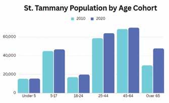 One of the most significant demographics changes shown in this report is the dramatic increase in the over-65 population in St. Tammany. The population over 65 saw a 37.9% increase from 2010-2020. This age group went from representing 12.7% of the population in 2010 with 29,634 residents to 18.1% of the population in 2020 with 47,710 residents. As the majority of people in this population cohort are typically retired empty-nesters, these numbers, combined with total population growth numbers, show the importance in investing in entertainment and leisure activities, higherend retail options, and healthcare infrastructure.