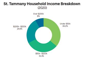 The 2020 Census American Community Survey reported the median household income in St. Tammany was $70,730, meaning half of households earn more and half earn less than that number. However, it’s important to note that the most common household income bracket is under $50,000, making up 36.2% of household earners. St. Tammany’s median income is 10% higher than the nation’s median household income and 40% higher than Louisiana’s median household income. Further, St. Tammany has the second highest median household income in the state, second to Ascension Parish’s median of $82,594.