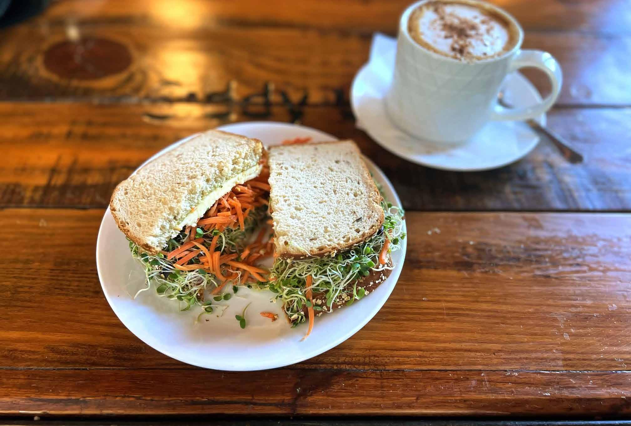 I typically choose black coffee or tea to drink, but they also offer all kinds of hot and cold chai and espresso drinks, plus smoothies. Their food menu includes a mix of soups and paninis, with clever twists on things, like their muffulini and reubeni. Everything they make is elevated by their use of fresh ingredients, but my favorites are their tomato, spinach and basil panini and the corn and crab bisque. The house-made bisque is super creamy with tons of flavor, and it rivals any fine dining restaurant.