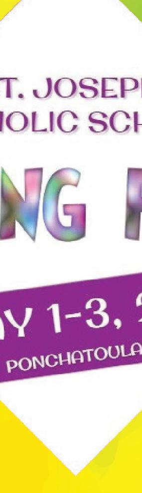 APRIL/MAY 33 LIVE ENTERTAINMENT RIDES JAMBALAYA/ PASTALAYA COOK-OFF FAIR FOOD SILENT AUCTION STUDENT PERFORMANCES Visit stjosephscatholicschool.org for more details! Pay-One-Price Ride Sessions as low as $25 Fri. May 1 • Category 6, DJ George Waddell Sat. May 2 • Bulletproof, 61 Suns, Parish County Line Sun. May 3 — No Idea 5K Run/Walk THANK YOU TO OUR DIAMOND SPONSORS: Strawberry Patch Pediatrics Champagne Beverage Company Northshore Broadcasting Matthew Moore, Artist Pot-O-Gold Waste Services Reeves Hardware & Rental Raffle for 2021 Camper from Berryland Motors RENT THE PARTY... Chairs Glassware more OWN THE MEMORIES! RENT THE TOOL... OWN THE PROJECT!