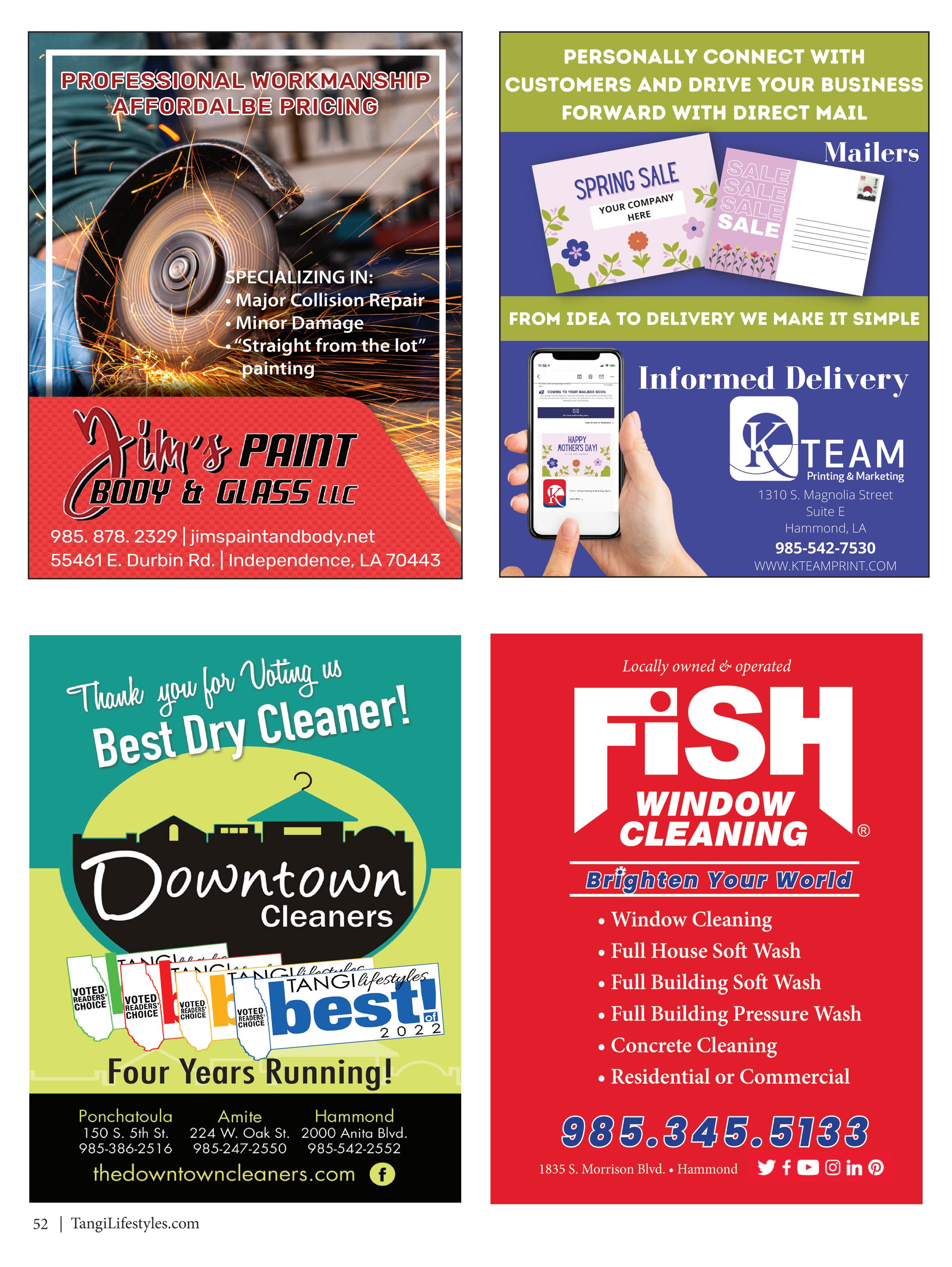 50 | TangiLifestyles.com 985.710.6482 • GOPROWASH.COM RESIDENTIAL & COMMERCIAL SOFT WASH PRESSURE WASHING • House Washing • Surface Cleaning FOR ALL YOUR EXTERIOR CLEANING NEEDS • Roof Cleaning • Deck Cleaning • Fence Cleaning • Window Washing • Gutter Cleaning 17-Point Oil Change Tune-Ups A/C Services Brake Services Radiator Services Tire Services Alignments Fluid Exchange Manufacturer’s Maintenance Maintenance & Repairs Filters Lighting Check Engine Light Wiper Blades 1301 N Morrison Blvd • Hammond • (985) 662-3338 • SpeeDeeOil.com/hammond-la-2030/ — M - F 8 - 5 | Sa 8 - 4 New brakes, oil change, tire rotation... you name it. SpeeDee does it all. —Hablamos Espanol— Owners Mark & Lorena Freeman Most vehicles. Discount off regular price. Charge for additional parts/service if needed. Not valid with other offers. Valid at Hammond, LA location only. No cash value. Taxes and/or disposal fees extra, where permitted. Void where prohibited. 17-POINT OIL CHANGE OFF $10 Expires 7/31/2022