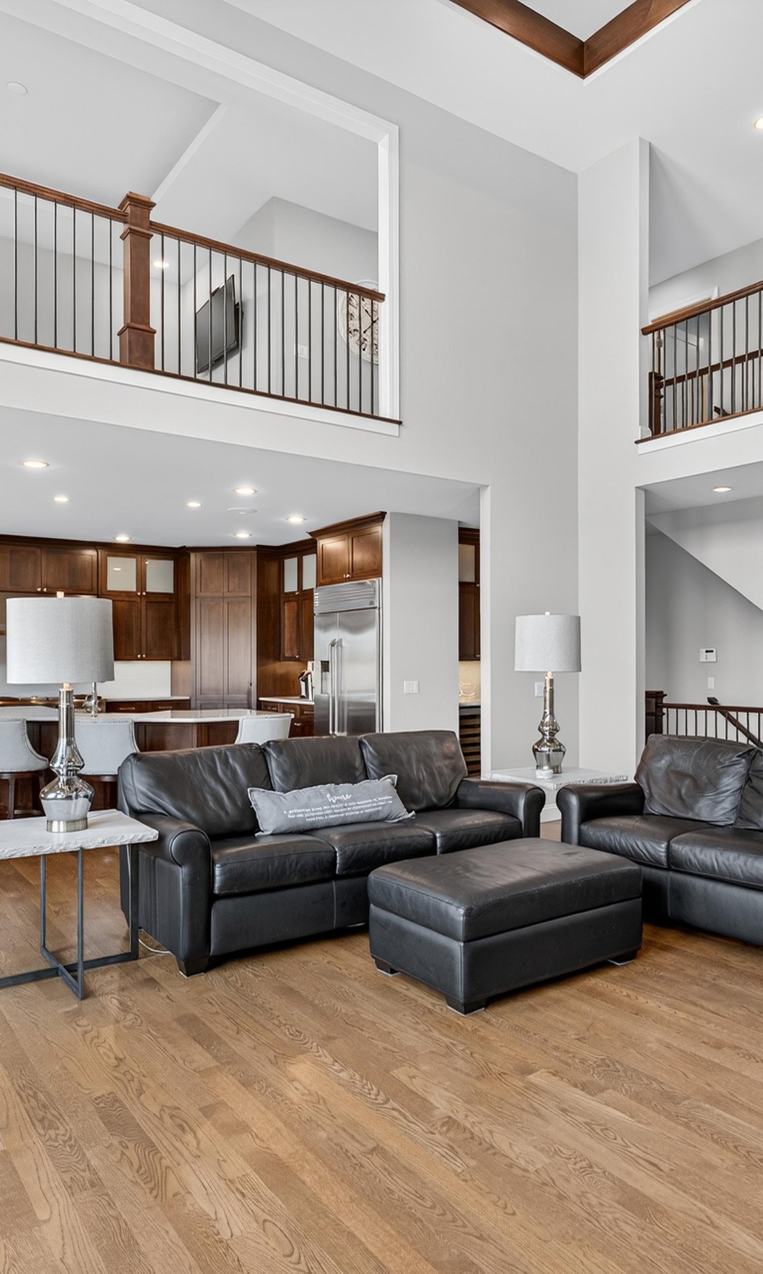 Sunlight pours in through large windows, illuminating an open floor plan that seamlessly connects the living room, dining area, and kitchen. A second-level catwalk overlooking the great room and kitchen brings the main floor together with a view. The heart of the home—a gourmet kitchen—features highend appliances, custom cabinetry and a sleek mixture of granite and quartz countertops, making it a hub of culinary creativity for family meals. Two gas fireplaces add warmth and charm, while the finished sunken basement with built-in bar includes space for a home theater, gym, or game room.