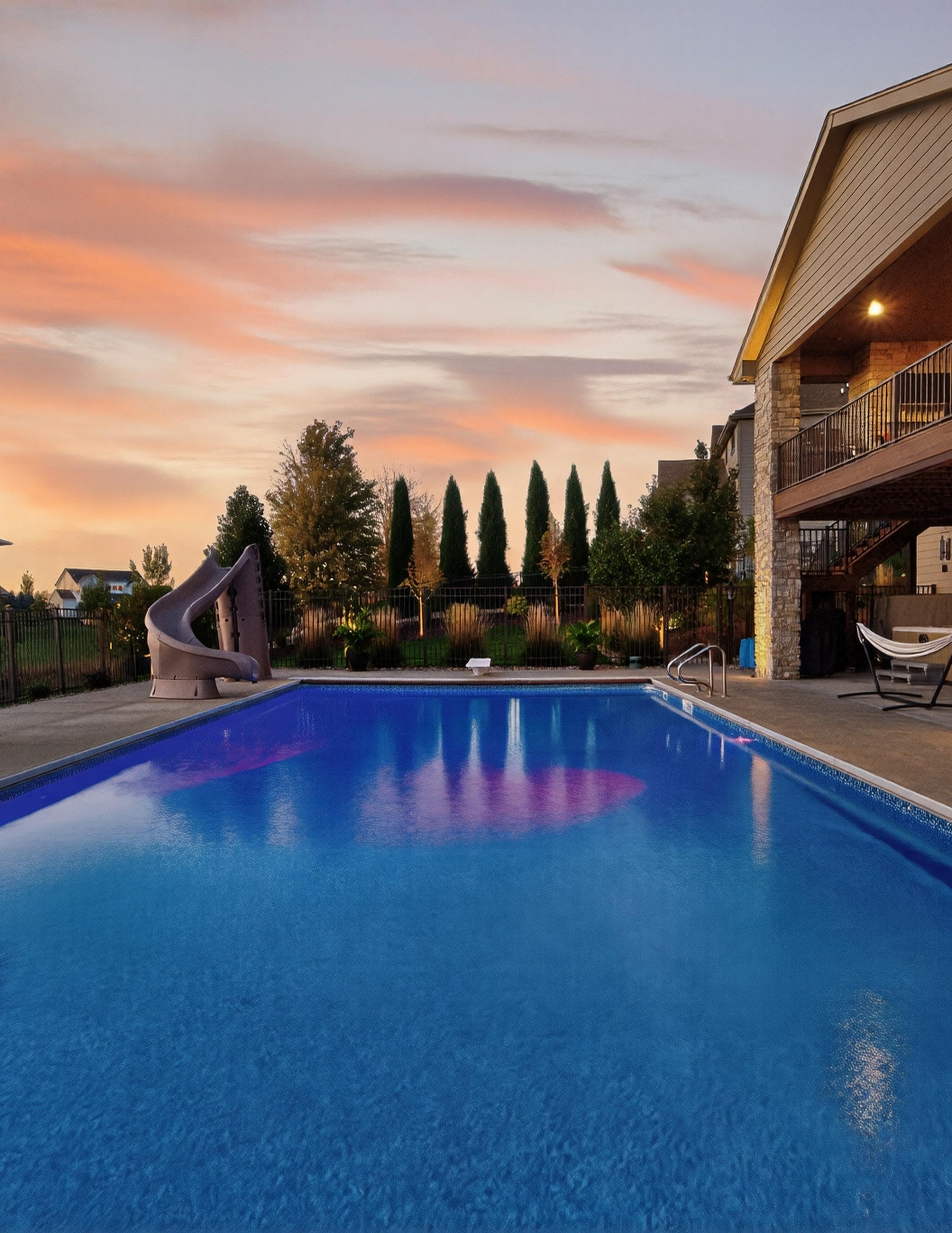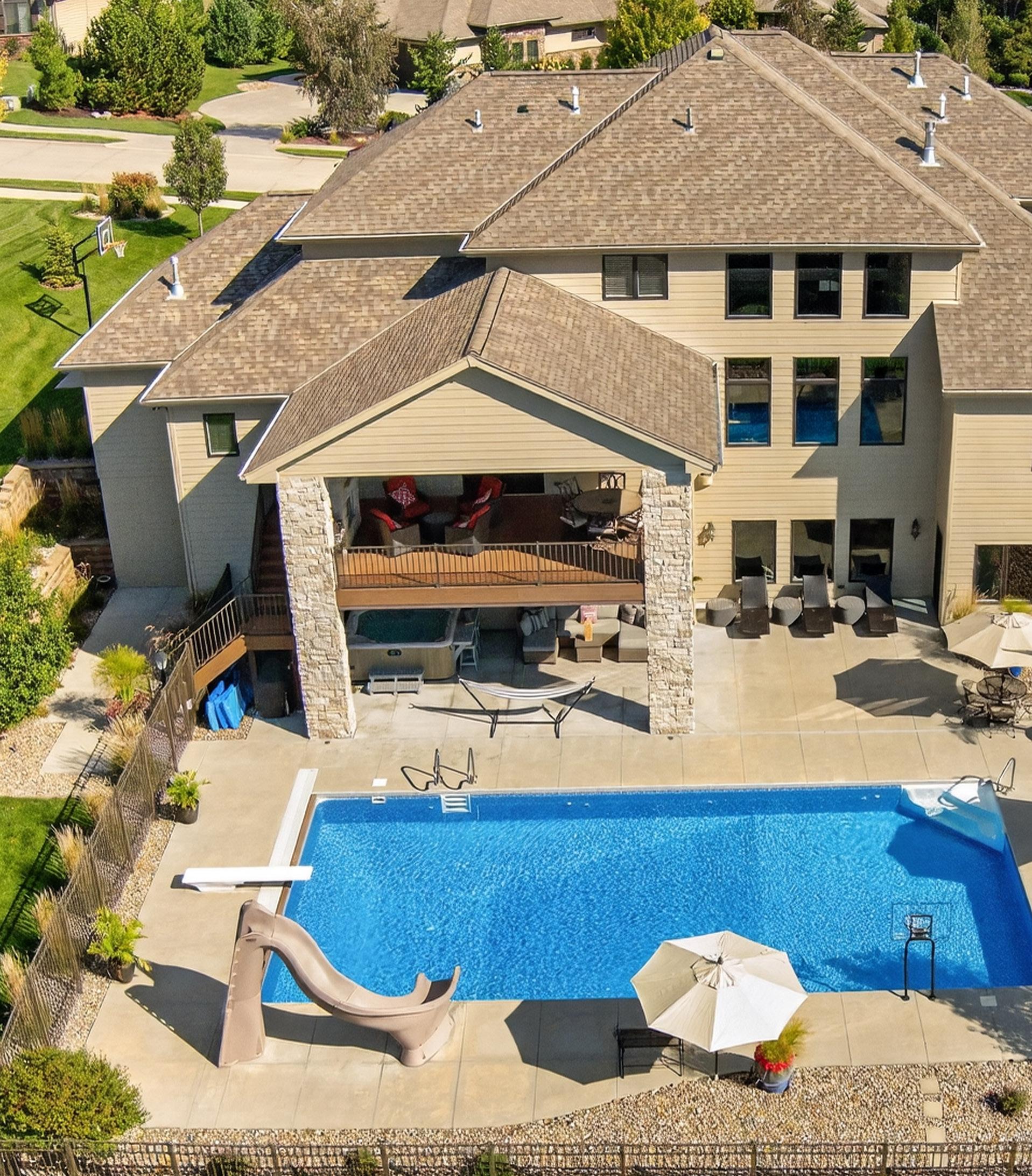 ground saltwater pool sparkles under the Nebraska sun, inviting summer gatherings and quiet morning swims with slide and diving board. A large, covered deck (24x12) replete with fireplace and outdoor TV brings the inside and outside together for cool spring and fall days and evenings.