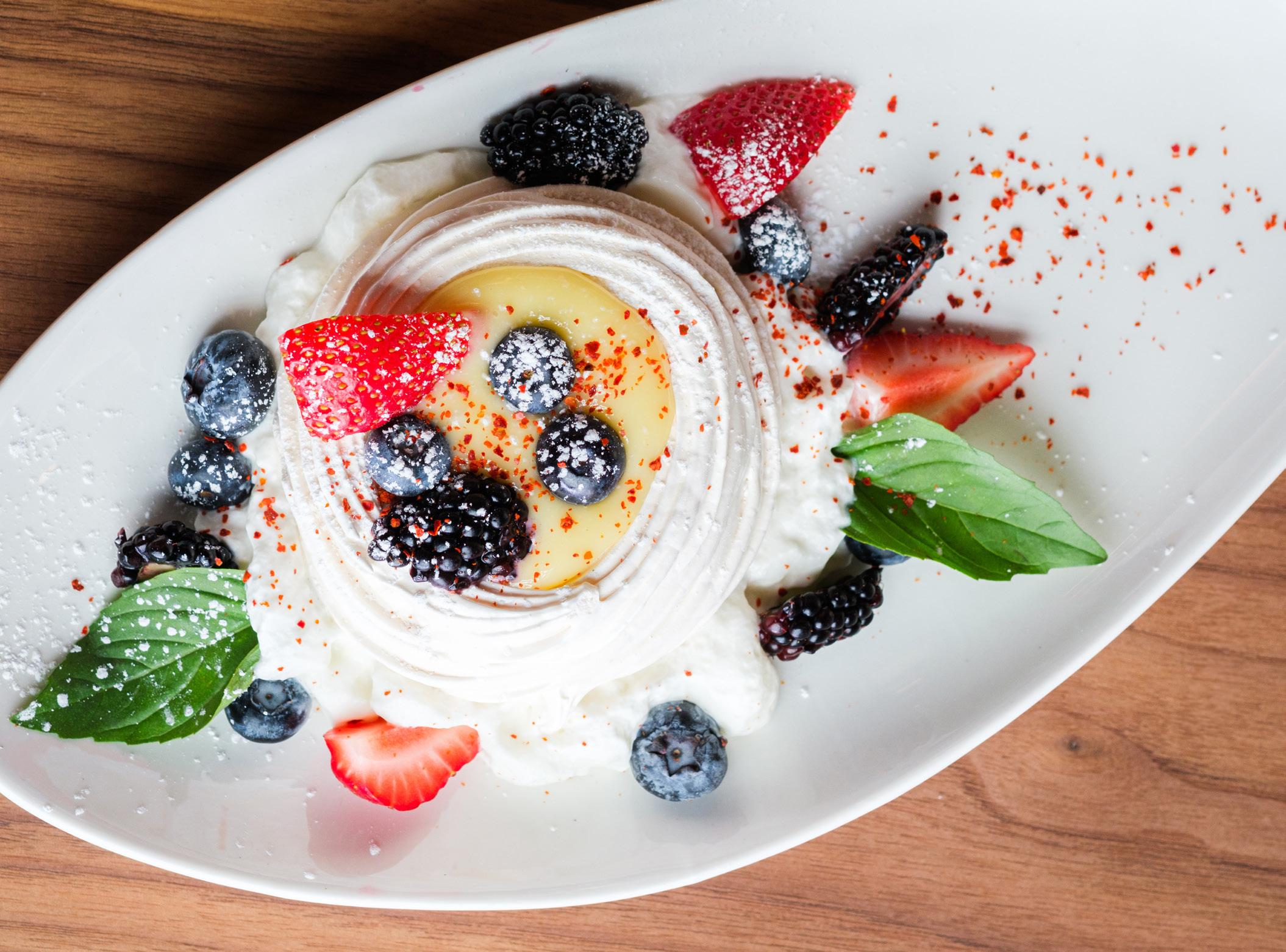 with dates, brown butter crumble, fresh vanilla ice cream, smothered in an “absurd” amount of butterscotch, according to Osentoski. The wild berry pavlova’s meringue features whipped egg whites slowly cooked at low temperature, crispy outside, gooey inside, with the look and texture of a marshmallow. It’s topped with lemon curd and choice wild berries. Beyond those, Osentoski bakes cookies
