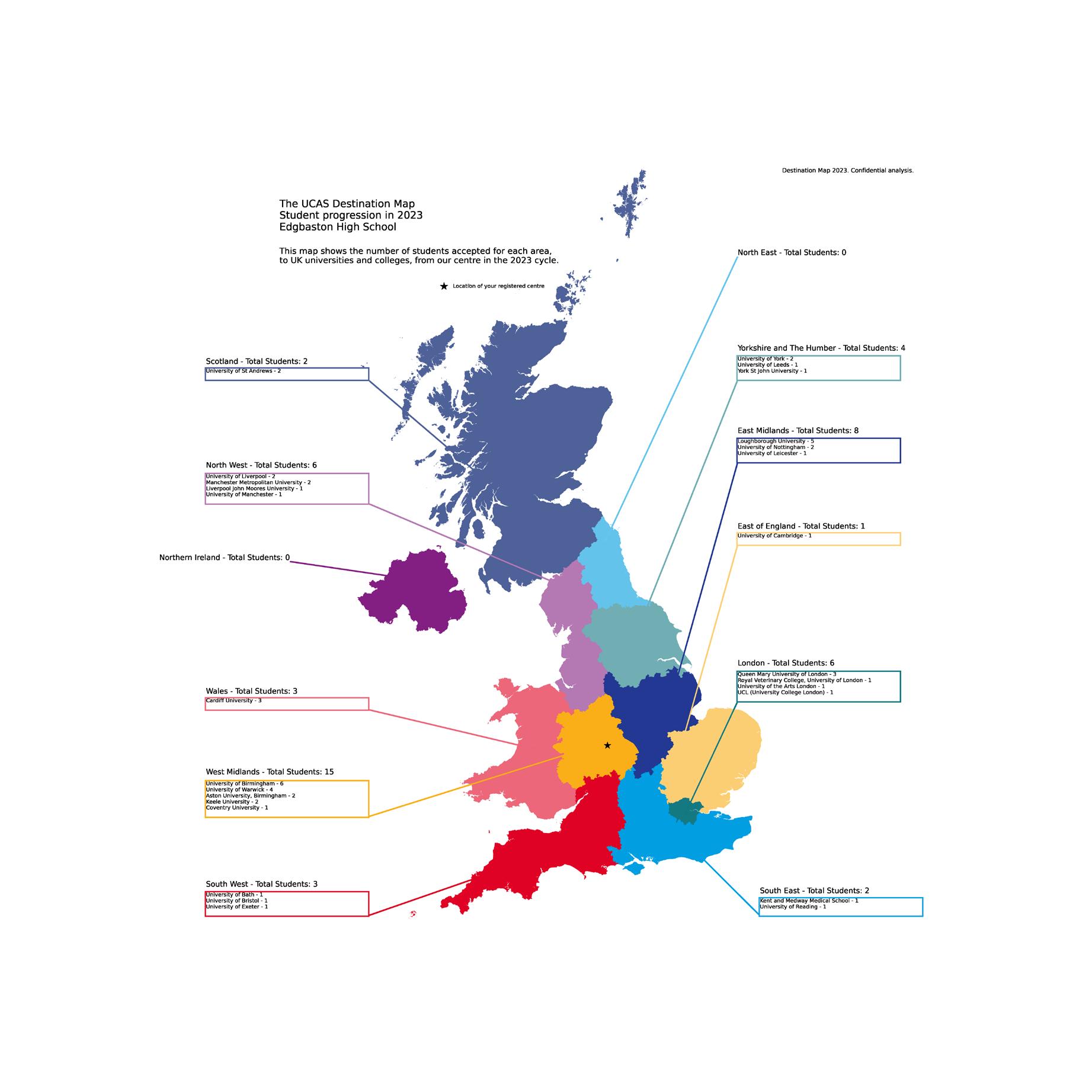 The map below shows the numbers and destinations of Edgbaston High School students accepted by UK universities and colleges in the 2023 cycle. Visit the school website to see what degree courses our students go on to study.