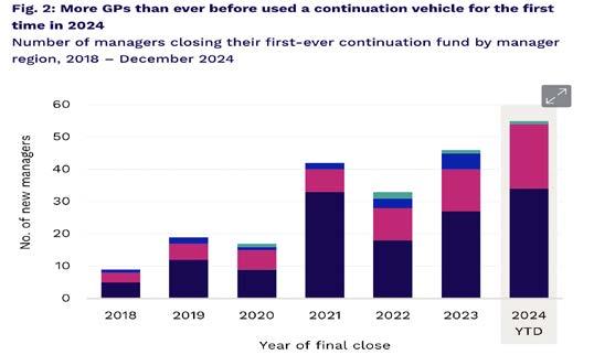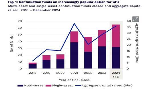 crescita dai 57 fondi raccolti in tutto il 2023, il tutto per un capitale aggregato di 36 miliardi di dollari raccolto nel 2024 che si avvicina al massimo del 2021 di 38 miliardi di dollari (si veda articolo di BeBeez ).Il tutto con la proporzione tra fondi multi-asset e single-asset che si è via via livellata a favore dei fondi con un singolo asset, con 32 fondi multiasset e 33 single-asset raccolti nel 2024, secondo Preqin , mentre nel 2021 su un totale di 55 fondi di continuazione, 39 (il 71%) era multi-asset e solo 16 (29%) erano single-asset.