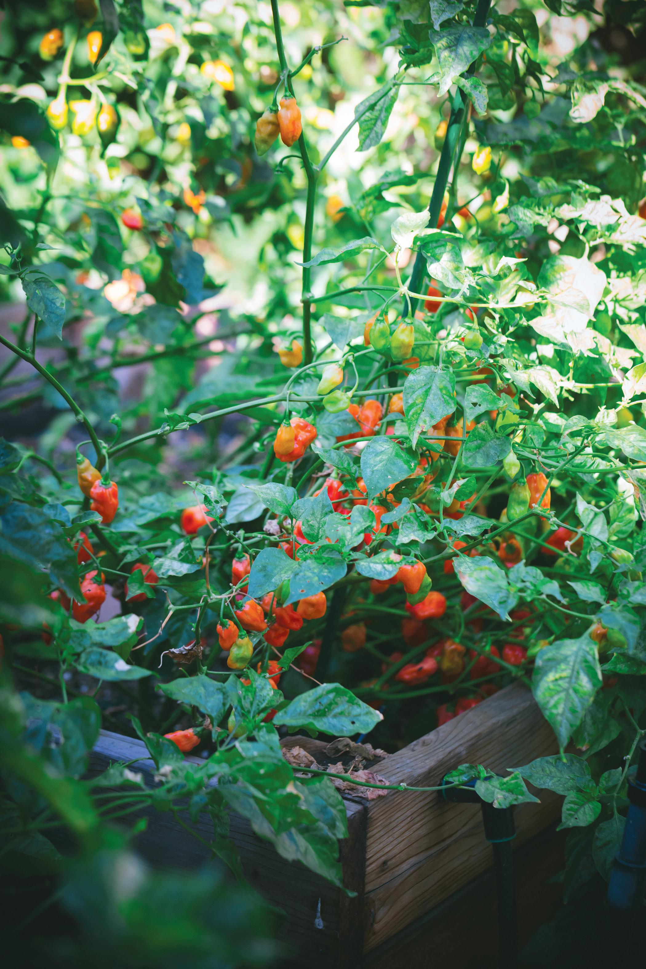 “One thing led to another,” Mudge says. “We’ve been jarring foods for years. Right around this time we were making quarts and quarts of chili pepper sauces and pro cessing all the things we grew. These are things we con sume and we share. When we went on lockdown, we ex panded all the raised beds in our yard. I started buying a bunch of pepper plants, like Black Cobra, Scotch Bonnet and Trinidad Scorpion pepper—which was red. I figured, ‘I’m a redhead and Scorpio.’ So it was a natural.”