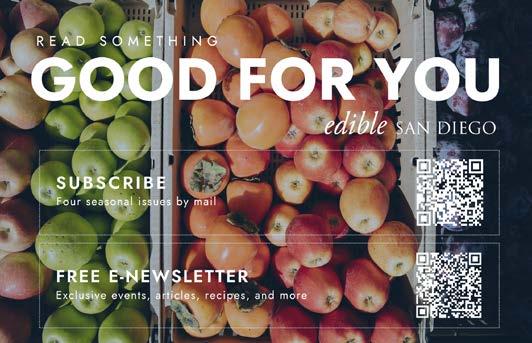 Edible San Diego magazine is a quarterly publication made available by subscription and free distribution at select locations throughout San Diego County. No part of this publication may be used or reproduced without permission from the publisher. Information in this magazine has been obtained from sources believed to be reliable. The publisher disclaims all liability for any occurrence that may arise as a consequence of the use of information or recipes. Every effort is made to avoid errors, misspellings, and omissions. If an error comes to your attention, please accept our sincere apologies and notify us.