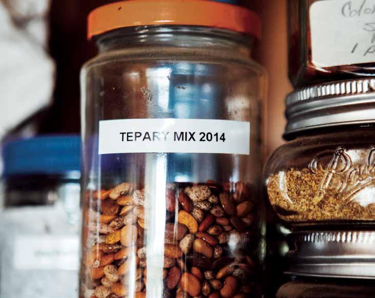 We plant five varieties of tepary beans at Rio Del Rey, including one we developed over three years from tepary bean variants. Growing these specific varieties conserves water and produces more beans per acre than other heirloom beans. The future lies in this bean: It is heat- and drought-tolerant, grows on poor soils, and has a protein content near 24%! With continued research, the tepary bean will be a big part of the solution in our adaptation to climate change. D