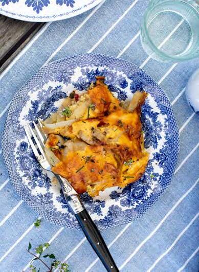 • Barbecue-Spiced Roast Chicken with Peaches and Potatoes