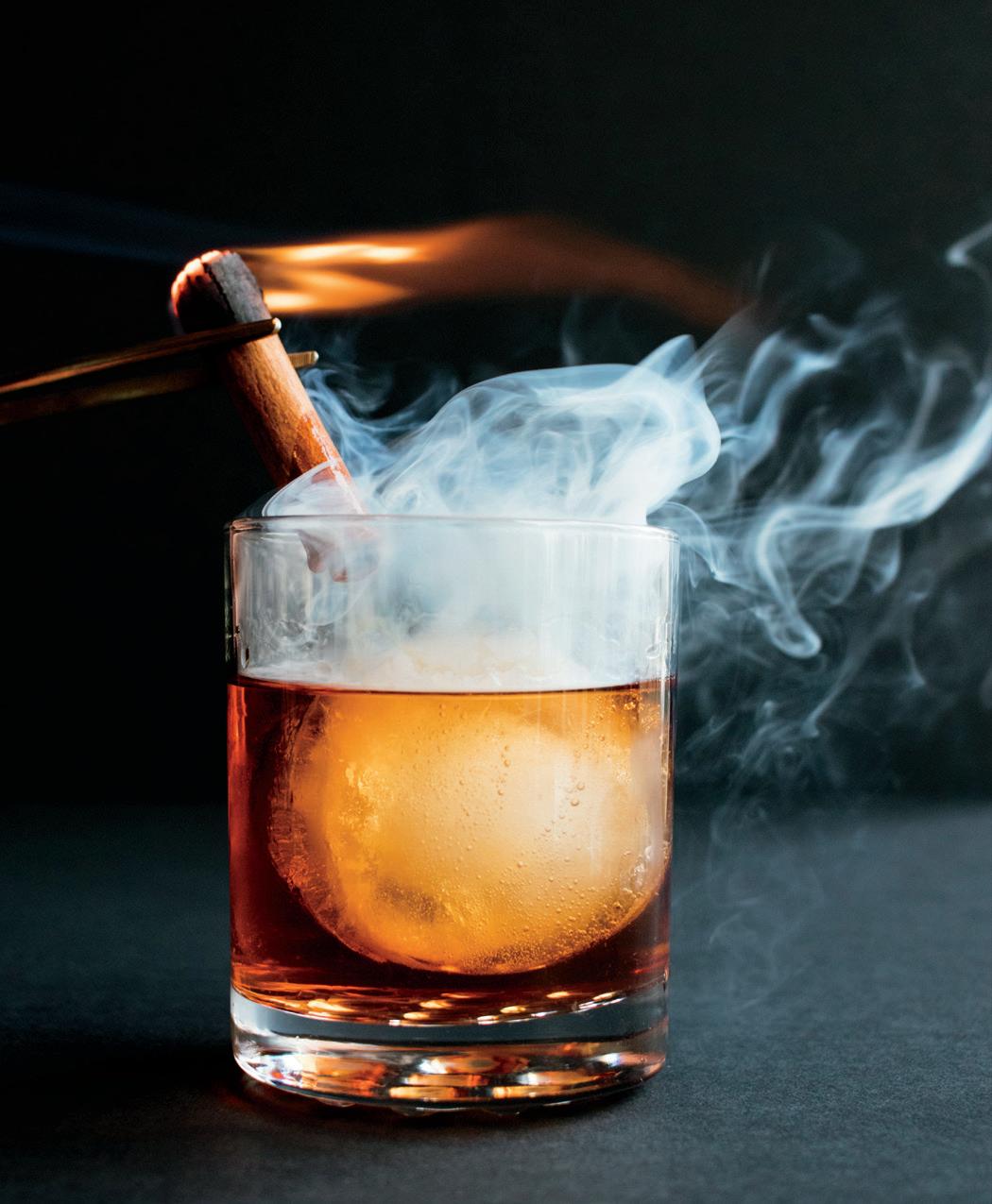 Stir all ingredients with ice until very cold. Strain into a small decanter and add rosemary vapor. Pour over a highball glass filled with ice.