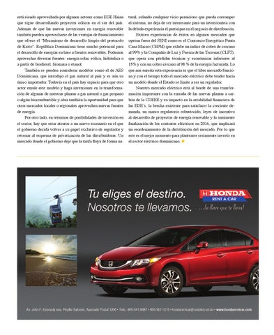 está siendo aprovechada por algunos actores como EGE Haina que sigue desarrollando proyectos eólicos en el sur del país. Además de que las nuevas inversiones en energía renovable también pueden aprovecharse de las ventajas de financiamiento que ofrece el “Mecanismo de desarrollo limpio del protocolo de Kioto”. República Dominicana tiene mucho potencial para el desarrollo de energías en base a fuentes renovables. Podemos aprovechar diversas fuentes: energía solar, eólica, hidráulica o a partir de biodiesel, biomasa o etanol. También se pueden considerar modelos como el de AES Dominicana, que introdujo el gas natural al país y es aún su único importador. Todavía en el país hay espacio para que otro actor emule este modelo y haga inversiones en la transformación de algunas de nuestras plantas a gas natural o gas propano o algún biocombustible y abra también la oportunidad para que otros mercados locales o regionales aprovechen nuevas fuentes de energía. Por otro lado, en términos de posibilidades de inversión en el sector, hay que estar atentos a un nuevo escenario en el que el gobierno decida volver a su papel exclusivo de regulador y retornar al esquema de privatización de las distribuidoras. Un mercado donde el gobierno deje que la tarifa fluya de forma na-