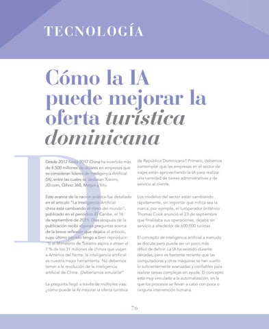 Este avance de la nación asiática fue detallado en el artículo “La Inteligencia Artificial china está cambiando el ritmo del mundo”, publicado en el periódico El Caribe Caribe, el 16 de septiembre de 2019. Días después de la publicación recibí algunas preguntas acerca de la breve reflexión que dejaba el artículo, cuyo último párrafo tengo a bien reproducir: “Si el Ministerio de Turismo aspira a atraer el 7 % de los 31 millones de chinos que viajan a América del Norte, la inteligencia artificial es nuestra mejor herramienta. No debemos temer a la revolución de la inteligencia artificial de China. ¡Deberíamos emularla!”