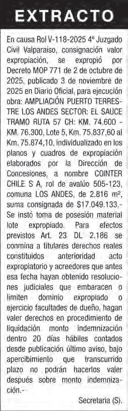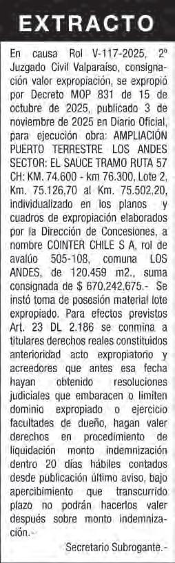 Por Decreto (Exento) MOP. Nº 1172 de 27 de noviembre de 2025, se tuvo por desistida la expropiación del lote de terreno N° A24-3, ordenada por Decreto (Exento) MOP. Nº 1407 de 30 de noviembre de 2020, para la obra "CONCESIÓN EMBALSE LAS PALMAS, COMUNA DE PETORCA, PROVINCIA DE PETORCA, REGIÓN DE VALPARAÍSO”. En todo lo no modi cado se mantiene plenamente vigente el Decreto (Exento) MOP. Nº 1407 de 30 de noviembre de 2020. La publicación se efectúa en cumplimiento a lo dispuesto en los artículos 7° y 32° del Decreto Ley Nº 2186, de 1978. Fiscalía MOP.