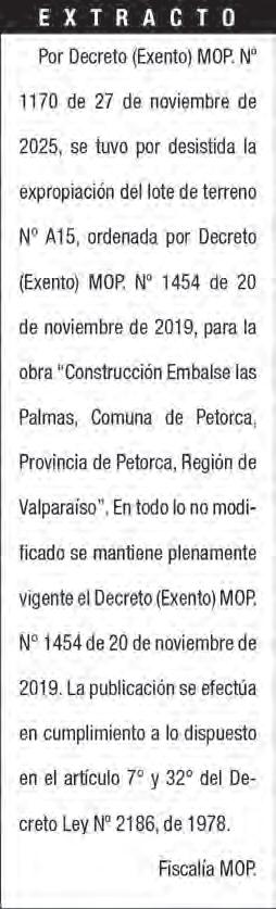 CITACIÓN SEÑORES accionistas: El Directorio de la Asociación de Canalistas Sociedad del Canal de San Pedro, cita a usted a la Junta General Ordinaria de Accionistas, para el jueves 26 de marzo de 2026, a las 17:00 horas, en primera citación y a las 17:30 horas, en segunda citación, formándose sala en este último caso con las personas que asistan, en el Liceo Agrícola Profesor Víctor Olguín Morales, Troncal Paradero 3 de Quillota. Tabla: 1.- Lectura acta anterior. 1.- Balance y Memoria año 2025. 3.- Situación Financiera. 4.- Elección de Directorio. 5.Revisores de Cuentas. 6.- Varios. El Directorio.