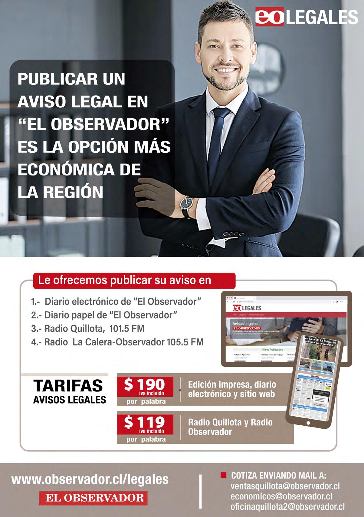 conforme tasación fiscal, precio pagadero dentro de tercero día hábil de efectuada esta. Los interesados en participar en el remate deberán tener activa su Clave Única del Estado y constituir garantía suficiente, consistente en vale vista tomado a la orden del tribunal, por el 10% de la cantidad mínima fijada para participar en la subasta, indicándolo así expresamente el instrumento y el que será remitido digitalizado al correo jl1_quilpue_remates@pjud.cl y a acorderoc@pjud.cl, junto con una fotocopia de la cédula de identidad del postor. En dicho correo, se indicará el rol de la causa en la que participará, correo electrónico del participante y un número telefónico para el caso en que se requiera tomar contacto con él durante la subasta y será enviado con una anticipación mínima de 4 días hábiles a la fecha fijada para el remate. Dicho documento será acompañado materialmente al tribunal dentro del plazo fijado en las bases para el pago del precio de remate, solo en caso de que el postor o tomador se adjudique el bien subastado. Una vez constituida la garantía, los postores recibirán correo electrónico indicando el día y hora del remate y el ID y clave de la videoconferencia. Es de cargo de los interesados en participar en la subasta disponer de los elementos tecnológicos y de conexión remota necesarios para participar en ella. Demás bases y antecedentes en Juicio Ejecutivo “Banco de Chile con Rojas” Rol C-755- 2024. Secretaría.