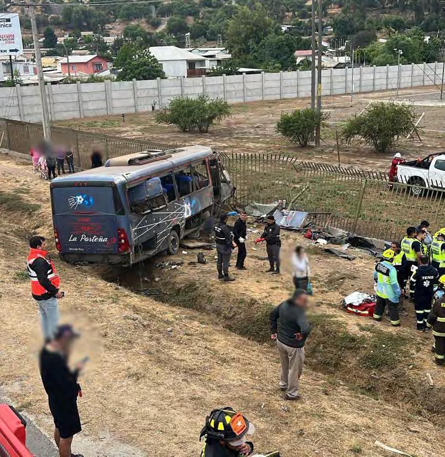 “Este bus de locomoción colectiva, por causas que se investigan, desvía su desplazamiento hacia la izquierda, impactando con una barrera de hormigón. Producto de ello, redirecciona su desplazamiento hacia la derecha, saliendo del borde de calzada y cayendo por un precipicio, donde a posteriori impacta con una reja perimetral”, explicó el oficial.