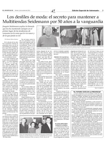 do de su fundador, pasándose a llamar Multitiendas Seidemann. PRODUCTO NACIONAL La historia de Seidemann es, en parte, la historia de la evolución en las tendencias de consumo de los habitantes de nuestra zona. Ello, porque la tienda ha intentado mantener su espíritu vanguardista y, con ello, ir de la mano con la evolución en los gustos y necesidades de los compradores en el país. Pero aquí la multitienda local ha querido enfrentar la competencia con una idea base: la preferencia por la industria manufacturera nacional, en vez de las importaciones, decisión que derivó en que muchas marcas se posicionaran en la actual Provincia de Quillota y sus zonas vecinas. “Nosotros siempre le dimos preferencia a las buenas marcas nacionales, ya que intentamos llevar a nuestro público la mejor mercadería. Actualmente, contamos con marcas importadas, pero la gente aún sigue prefiriendo el producto nacional, ya que estas son más conocidas, de una mejor calidad y pueden llegar a durar toda una vida. A la gente le gusta tener marcas conocidas, le da cierto prestigio, no les gustan las cosas que se hacen en grandes cantidades y que son más repetidas. Eso nos posicionó en la provincia”, explica Joaquín Seidemann a “El Observador”. 50 AÑOS IMPONIÉNDOSE EN LA MODA La década de los 50 se caracterizó por devolver el glamour a la mujer chilena, a pesar de la recesión que se estaba viviendo en el país. El “look” al cual aspiraban las féminas era sobrio y sutil, privilegiando los vestidos