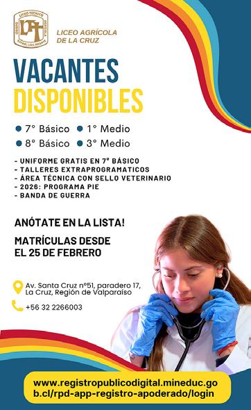 EL COLEGIO Valle del Aconcagua de Quillota requiere docentes de educación general básica, con experiencia en primer ciclo. Deseable certificación B2 de inglés (no excluyente). Enviar CV a: rrhh@valledelaconcagua.cl 33 234 6240