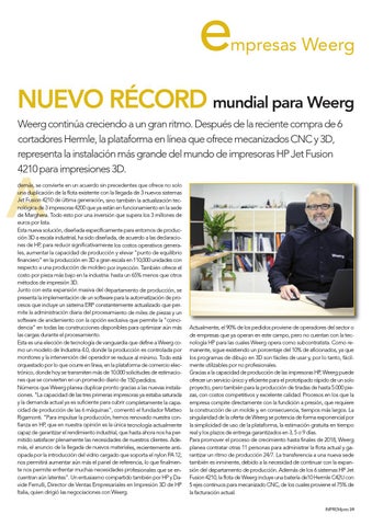 demás, se convierte en un acuerdo sin precedentes que ofrece no solo una duplicación de la flota existente con la llegada de 3 nuevos sistemas Jet Fusion 4210 de última generación, sino también la actualización tecnológica de 3 impresoras 4200 que ya están en funcionamiento en la sede de Marghera. Todo esto por una inversión que supera los 3 millones de euros por lista. Esta nueva solución, diseñada específicamente para entornos de producción 3D a escala industrial, ha sido diseñada, de acuerdo a las declaraciones de HP, para reducir significativamente los costos operativos generales, aumentar la capacidad de producción y elevar "punto de equilibrio financiero" en la producción en 3D a gran escala en 110,000 unidades con respecto a una producción de moldeo por inyección. También ofrece el costo por pieza más bajo en la industria: hasta un 65% menos que otros métodos de impresión 3D. Junto con esta expansión masiva del departamento de producción, se presenta la implementación de un software para la automatización de procesos que incluye un sistema ERP constantemente actualizado que permite la administración diaria del procesamiento de miles de piezas y un software de anidamiento con la opción exclusiva que permite la "coincidencia" en todas las construcciones disponibles para optimizar aún más las cargas durante el procesamiento. Esta es una elección de tecnología de vanguardia que define a Weerg como un modelo de Industria 4.0, donde la producción es controlada por monitores y la intervención del operador se reduce al mínimo. Todo está orquestado por lo que ocurre en línea, en la plataforma de comercio electrónico, donde hoy se transmiten más de 10.000 solicitudes de estimaciones que se convierten en un promedio diario de 150 pedidos. Números que Weerg planea duplicar pronto gracias a las nuevas instalaciones. "La capacidad de las tres primeras impresoras ya estaba saturada y la demanda actual ya es suficiente para cubrir completamente la capacidad de producción de las 6 máquinas", comentó el fundador Matteo Rigamonti. "Para impulsar la producción, hemos renovado nuestra confianza en HP, que en nuestra opinión es la única tecnología actualmente capaz de garantizar el rendimiento industrial, que hasta ahora nos ha permitido satisfacer plenamente las necesidades de nuestros clientes. Además, el anuncio de la llegada de nuevos materiales, recientemente anticipada por la introducción del vidrio cargado que soporta el nylon PA 12, nos permitirá aumentar aún más el panel de referencia, lo que finalmente nos permite enfrentar muchas necesidades profesionales que se encuentran aún latentes". Un entusiasmo compartido también por HP y Davide Ferrulli, Director de Ventas Empresariales en Impresión 3D de HP Italia, quien dirigió las negociaciones con Weerg.
