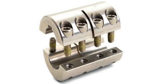 En las versiones de dos piezas, los tornillos están dispuestos uno frente al otro para garantizar un ajuste, una alineación y una fuerza de sujeción excelentes. Ruland ofrece de serie acoplamientos de acero inoxidable 1.4305 con tornillos del mismo material. El revestimiento antivibraciones patentado Nypatch evita el agarrotamiento de la rosca, garantiza un ajuste perfecto y permite utilizar los tornillos varias veces. Los acoplamientos rígidos están disponibles en diseños tipo abrazadera de una o dos piezas, con o sin chaveteros y con diámetros interiores de 3 mm a 50 mm. Bajo pedido, pueden suministrarse con dimensiones personalizadas, combinaciones de diámetros imperiales y métricos y en acero inoxidable 1.4401/1.4404.