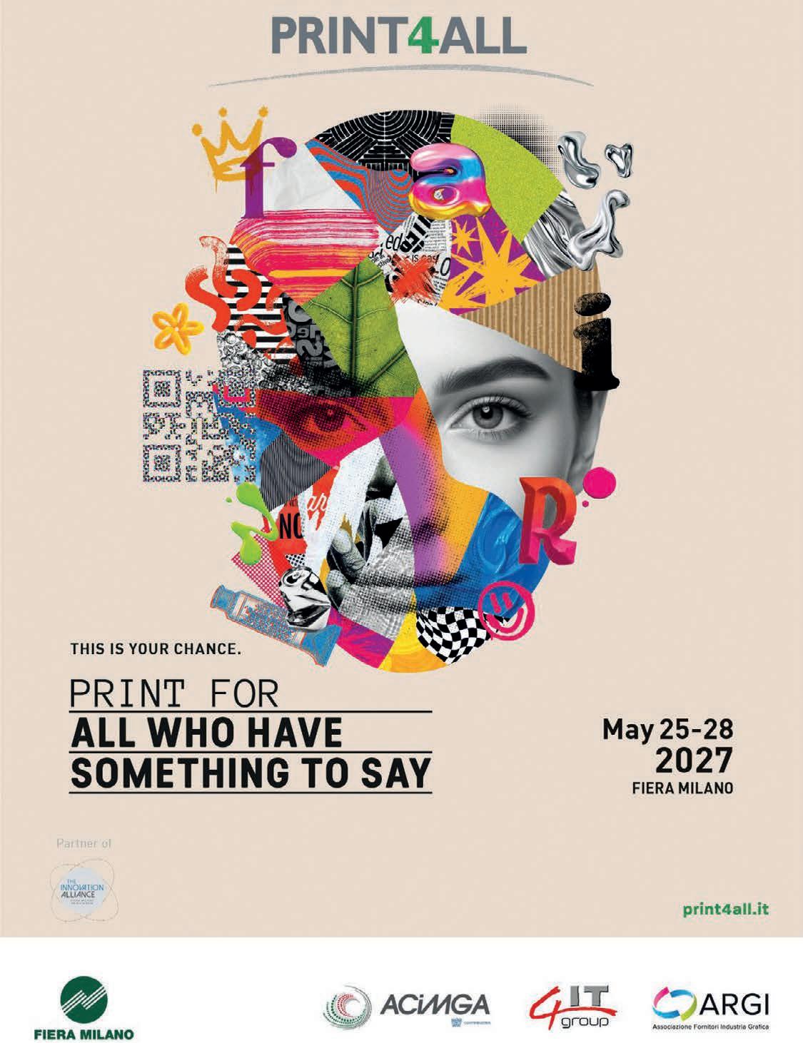 impulsa la nueva etapa de Print4All y ofrecer una interpretación original de la continua evolución del mundo de la impresión y la conversión, cada vez más cercana a las necesidades del público al que se dirigen los productos y embalajes impresos, y capaz de transmitir no solo mensajes e información, sino también sensaciones y emociones, se ha creado un nuevo visual colorido, multicapa y de gran impacto. Concebida y desarrollada por Advision, la imagen que representará a Print4All 2027 narra la historia de las infinitas expresiones de los productos impresos. La impresión no es solo un medio, sino lenguaje, materia, color y emoción. Las múltiples dimensiones de la impresión y la conversión se plasman en la imagen a través de una explosión de elementos que nos rodean, nos envuelven y llenan nuestras vidas de variedad. Texturas, papeles, tintas, tipografías, patrones, materiales y colores se fusionan para crear una composición vibrante, multicapa e inmersiva. El eslogan refuerza los valores de relación y comunicación eficaz que animan e inspiran las múltiples facetas de la impresión: «IMPRESIÓN PARA TODOS LOS QUE TIENEN ALGO QUE DECIR». Un mensaje clave dirigido al mercado, posiciona a Print4All como la feria comercial para cualquiera que tenga un mensaje que transmitir, afirmando que las tecnologías de procesamiento de materiales e impresión son herramientas estratégicas, potentes y versátiles al servicio de todos los mercados que necesitan comunicarse.