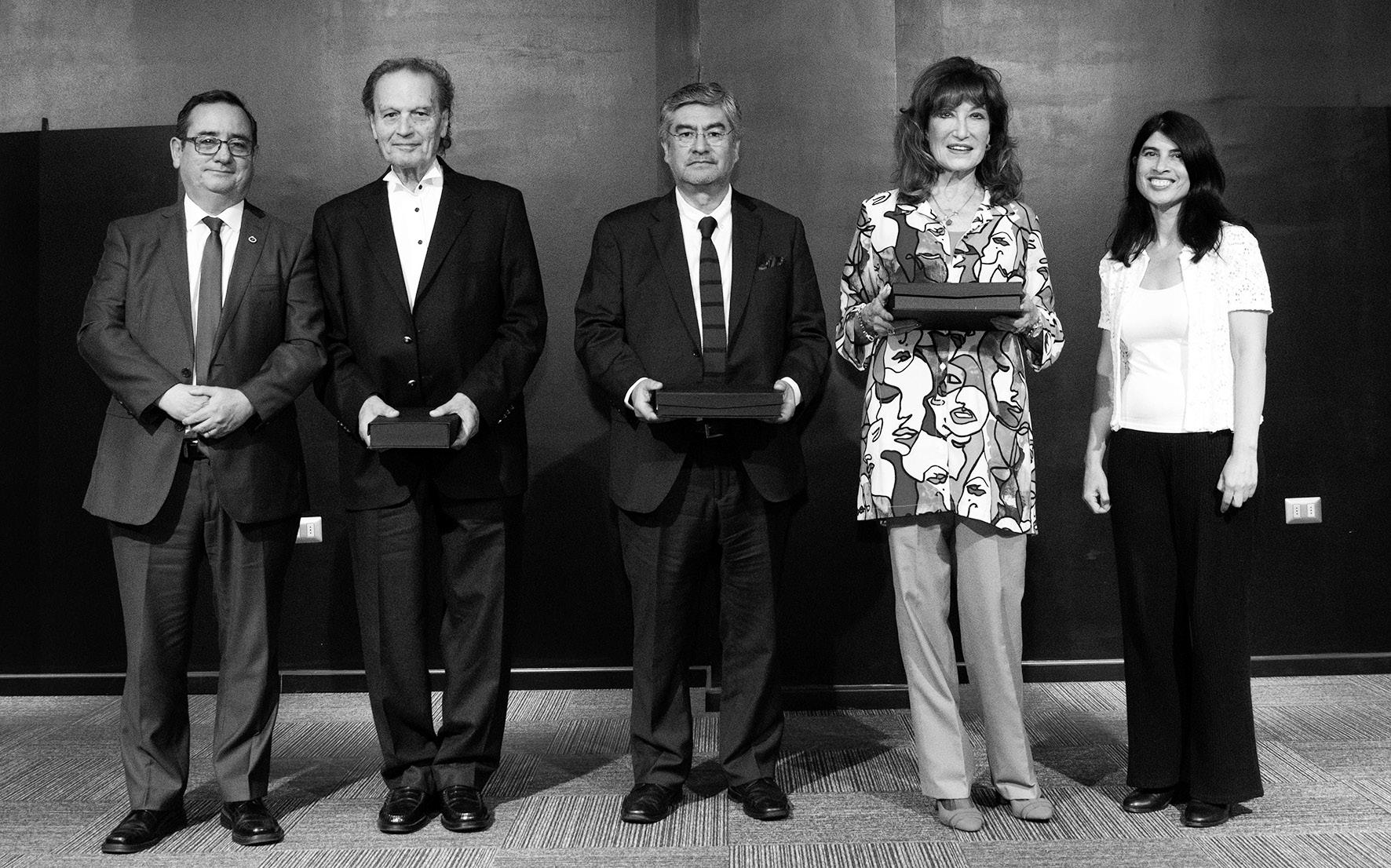 O Claudio Elórtegui, rector de la PUCV, Mónica Montejo, esposa de Renzo Devoto, y Gonzalo Duarte, Gran Canciller de la PUCV, en ceremonia de reconocimiento Fides et Labor póstumo al profesor Renzo Devoto, 2017