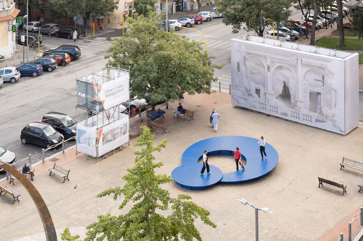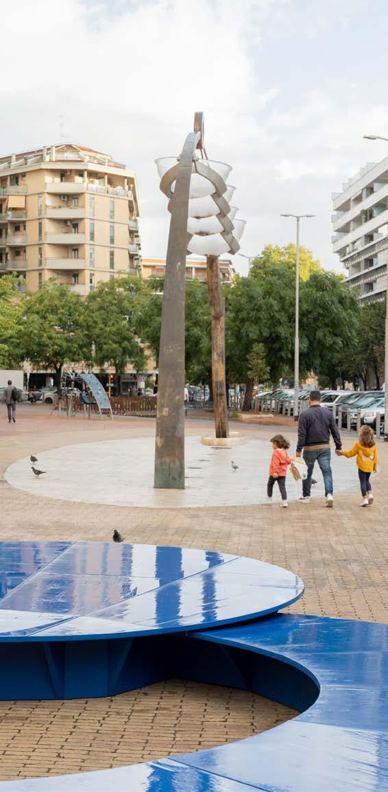 arti di strada si fondono con la comunità in un abbraccio inclusivo. Il progetto si configura come un palcoscenico urbano, un luogo di aggregazione spontanea dove si risvegliano l’interesse pubblico e la partecipazione civica. Realizzata interamente in legno, la struttura presenta un design radiale, simmetrico e baricentrico, con un anello inclinato di 7 metri di diametro e una piattaforma piana di 3,5 metri di diametro. La finitura è stata realizzata con una vernice blu a base d’acqua per legno, adatta per l’esterno.