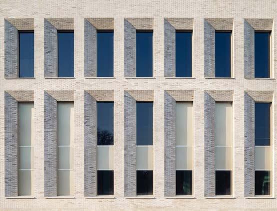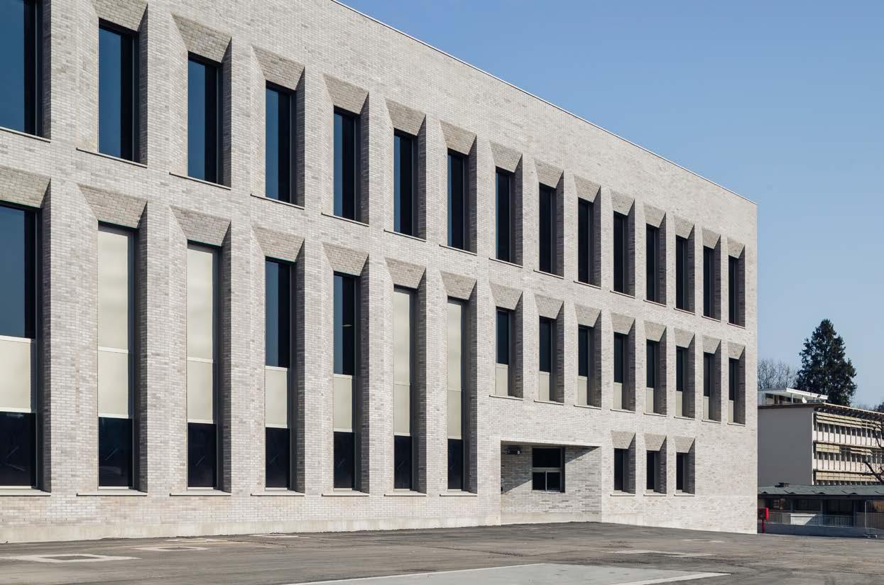 La struttura del prospetto avviene attraverso la definizione geometrica dei vuoti. Come per una trama, l’organizzazione del vuoto regola la dimensione della struttura verticale e orizzontale di prospetto in funzione del programma interno. La facciata ventilata, realizzata in elementi prefabbricati di cemento, è rivestita in mattoni, sviluppati con la ditta fornitrice, in argilla chiara grigio/ocra. Ne risulta un edificio la cui immagine non è legata a una moda estetica del momento ma il cui aspetto può resistere nel tempo senza compromettere la sua attualità e durabilità.