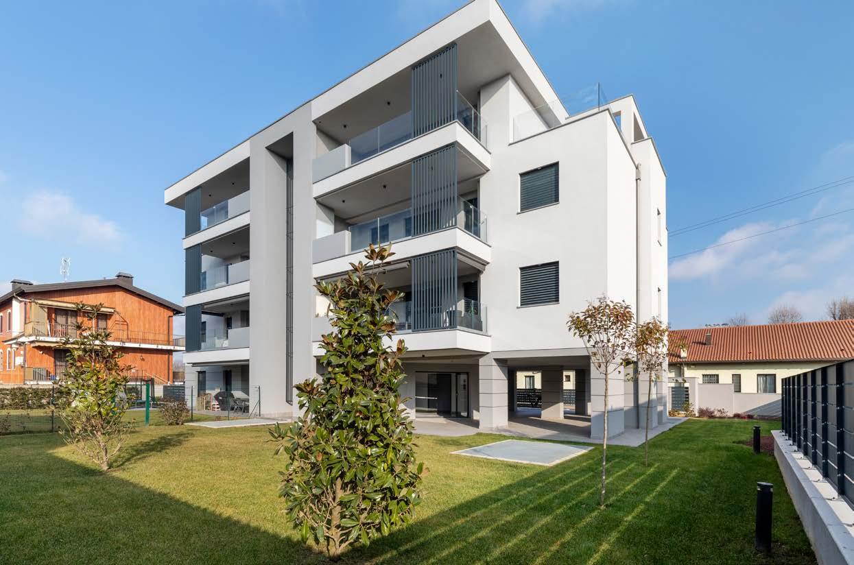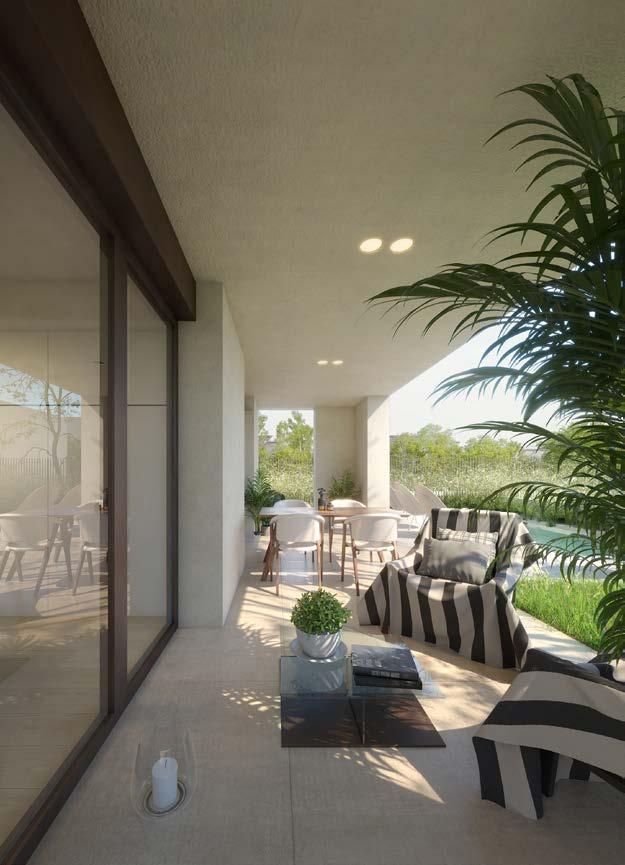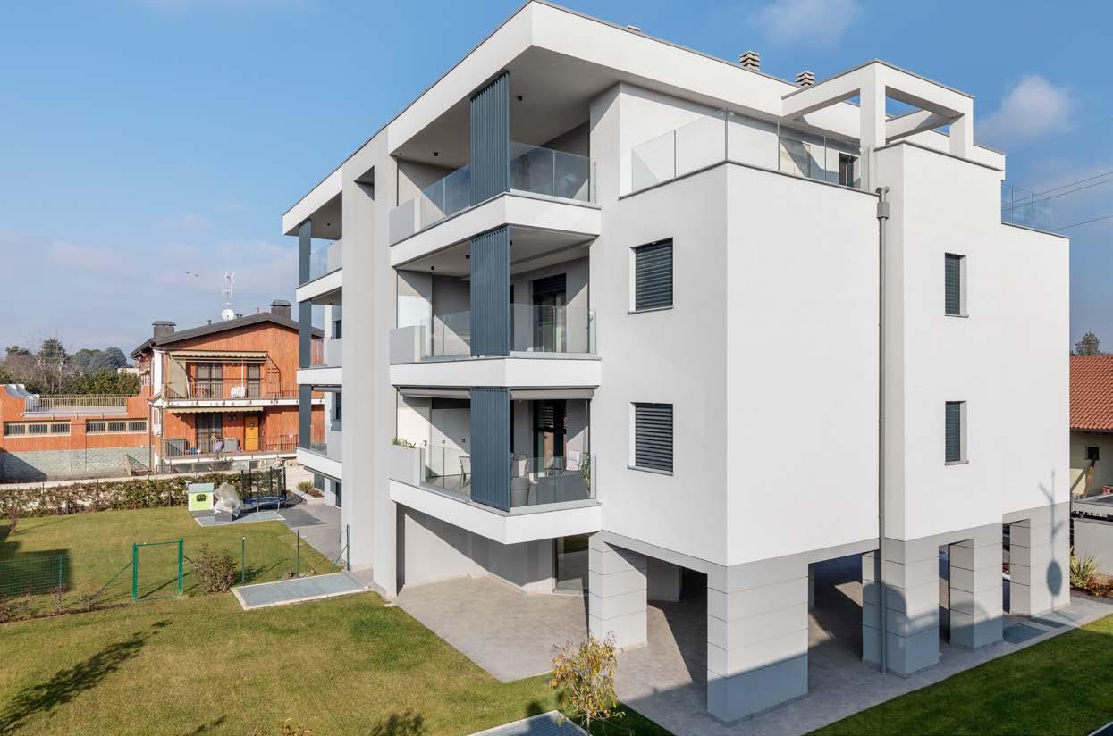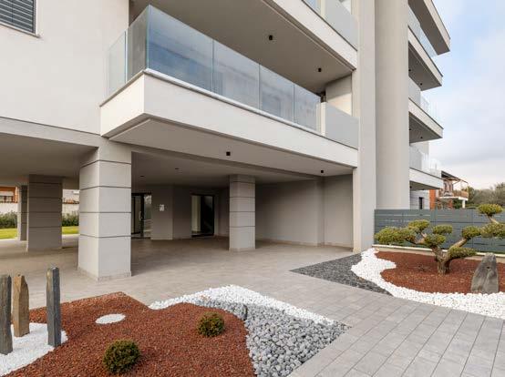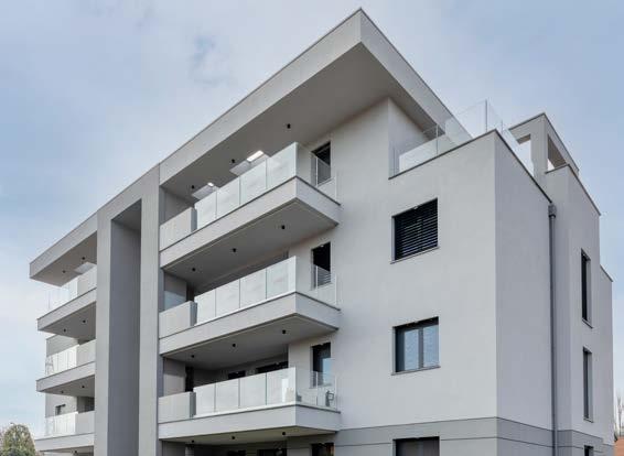 la realizzazione in Classe A3. Gli spazi esterni, sia comuni sia privati, sono stati accuratamente disegnati, dotando ogni appartamento di uno o più terrazzi con profondità di oltre 3 metri, bbq e locale tecnico dedicato a ospitare la pompa di calore a gestione autonoma. Anche gli elementi a verde sono stati selezionati con attenzione, così da dare vita a uno spazio comune di qualità che accoglie abitanti e visitatori. I prospetti dell’edificio sono caratterizzati dalle grandi balconate e sul retro dai sistemi di oscuramento del vano scala. Il tetto si presenta piano e ospita, nascosti alla vista, l’impianto fotovoltaico e le unità di ventilazione.