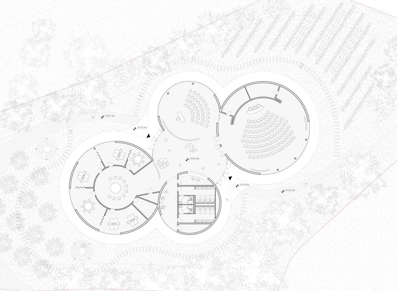 L’Hub offrirà tre spazi distinti ma complementari. Uno spazio polifunzionale utilizzato come sala formazione e degustazione, racconterà ad un pubblico più vasto le attività del centro agricolo sperimentale. Questo spazio è affiancato da un’auditorium in grado di ospitare eventi, workshop e conferenze per 100 persone. Inoltre, uno spazio didattico dedicato alla ricerca offrirà ai ricercatori un confortevole ambiente privato ma allo stesso tempo versatile e flessibile.