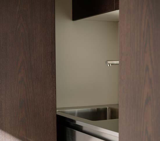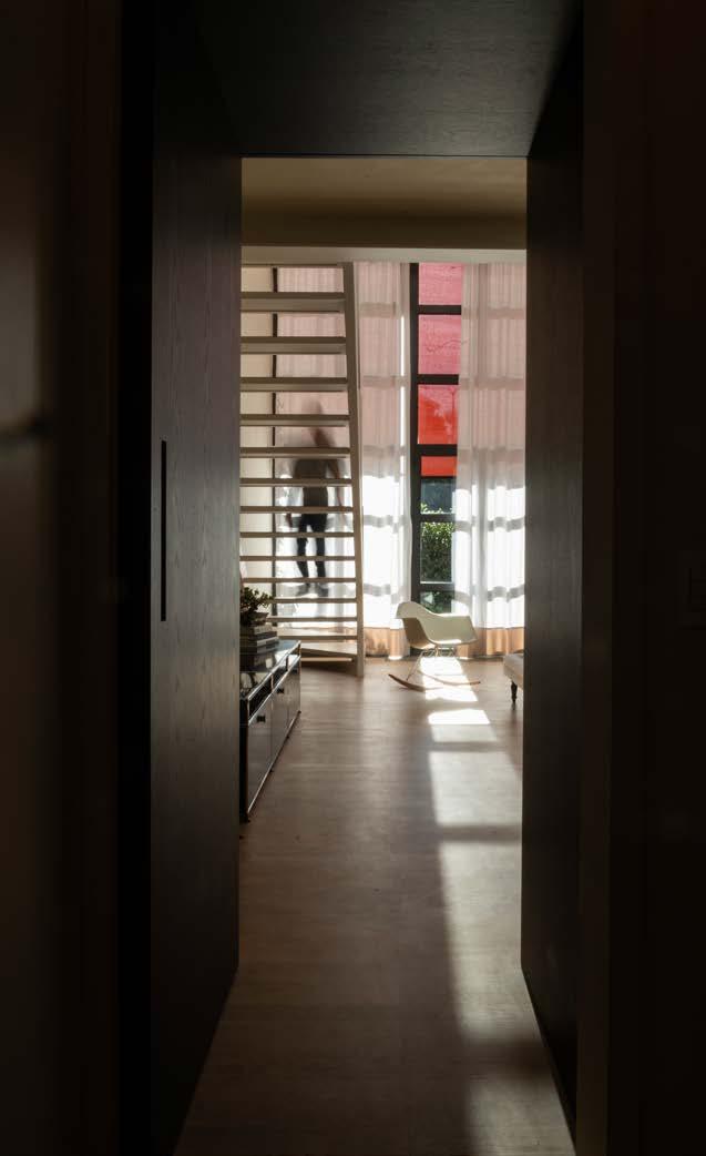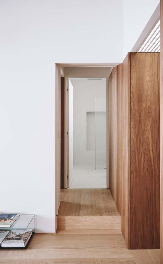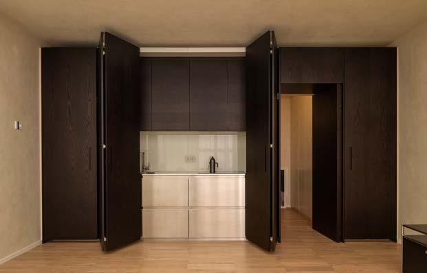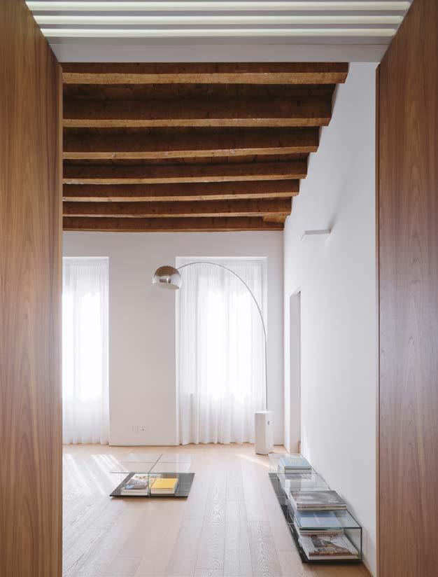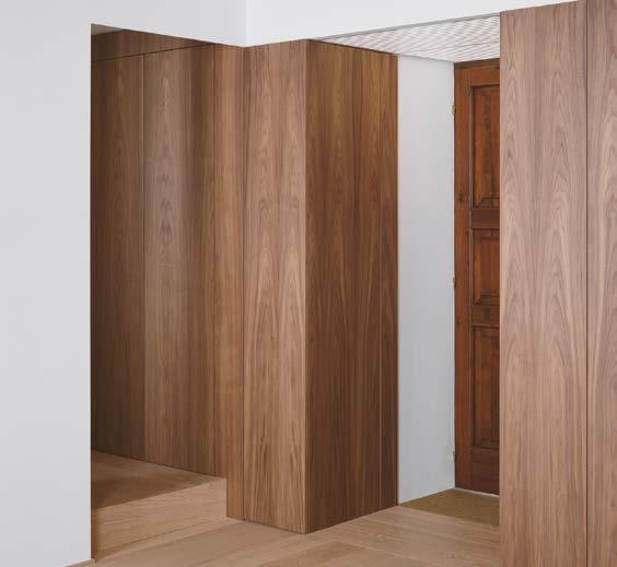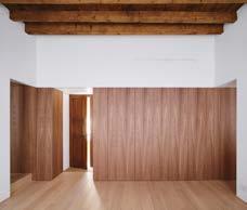 soggiorno e le colonne della cucina. In quella est, invece, distaccandosi dalla muratura, costruisce lo spessore abitato del bagno (verso la corte) e le armadiature dell’adiacente camera da letto (fronte strada). La nuova collocazione di bagno e cucina permette una libera articolazione degli spazi, prevedendo la possibilità di trasformare la zona pranzo in un’ulteriore camera singola. In corrispondenza dell’ingresso la continuità delle armadiature trova un momento di interruzione, rendendo evidente il proprio spessore, definendo uno spazio di mediazione tra una condizione esterna collettiva e una interna privata. Alla razionalizzazione degli spazi dal punto di vista planimetrico, corrisponde un linguaggio caldo e domestico definito dai toni lignei dei travetti esistenti, delle armadiature in essenza noce canaletto e dal rovere dei pavimenti.