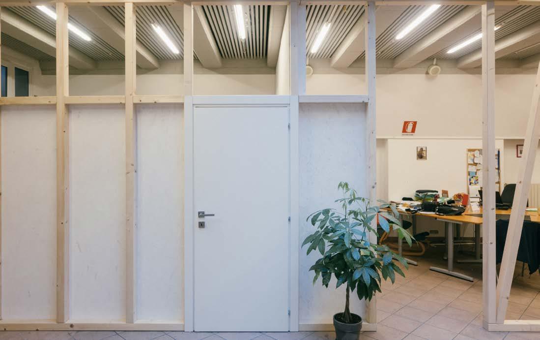Sono state realizzate alcune partizioni con struttura in legno e rivestimento in OSB, pitturato in bianco sul lato esterno per dare un senso di ordine in uno spazio così polifunzionale e con un grande flusso di persone. Una porta, l’unica e di recupero, rappresenta il chiaro segnale per chi entra di un luogo sicuro dove raccontare le proprie disavventure esistenziali ai volontari dell’associazione. All’interno il calore della texture dei pannelli in OSB regala un’atmosfera di accoglienza.