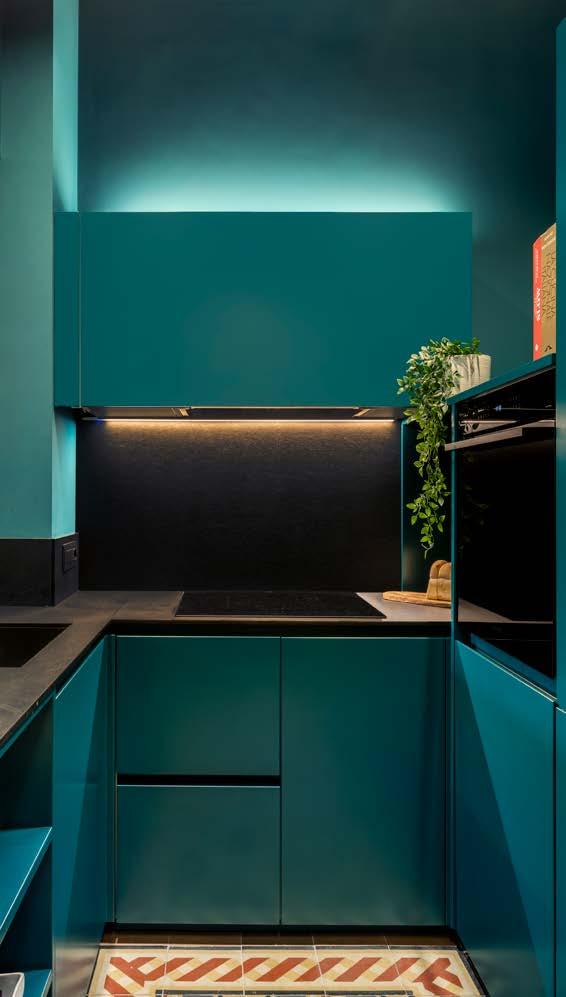 La cucina, in color block, vede l’accostamento di blocchi di colori vivaci e contrapposti per creare un forte impatto visivo, come ad esempio con piano a contrasto, ed è stata ricavata in un vano di soli 4 m 2, posto in prossimità del soggiorno al quale si collega mediante
