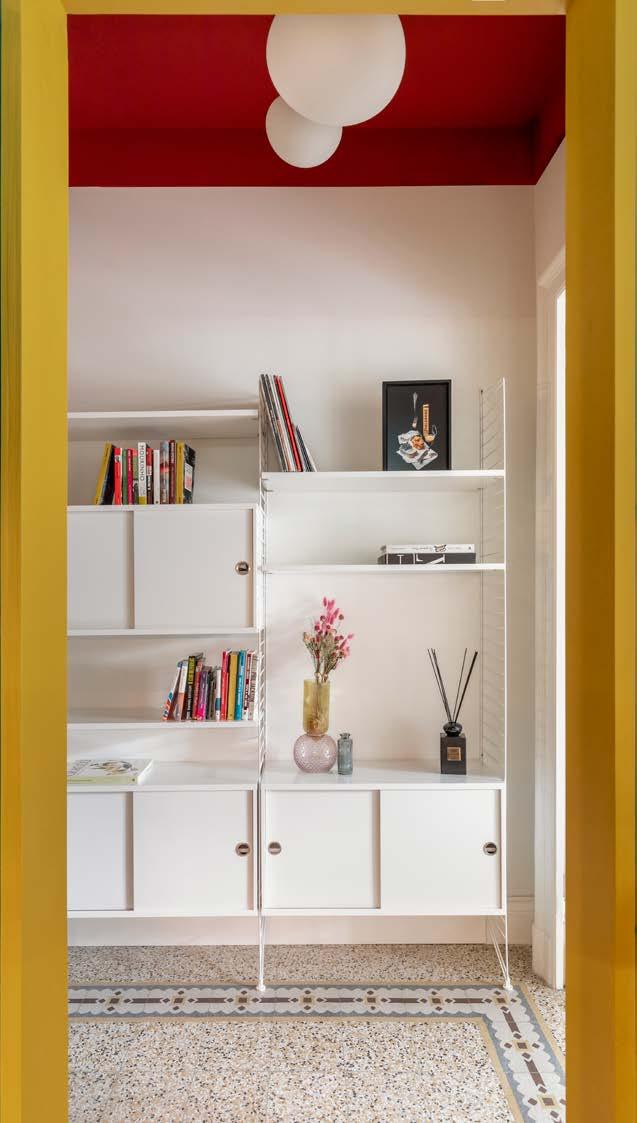 Il corridoio è lungo 11 metri e acquista risalto grazie alle decise scelte cromatiche e all’arredo che lo completa interamente con una libreria dotata anche di una piccola scrivania. Nel bagno, stretto e lungo, una doccia passante ha consentito di ottenere due bagni caratterizzati da nuovi rivestimenti riconoscibili. Uno dei due bagni si apre sul corridoio, mentre il secondo è accessibile dalla camera. Quest’ultima dialoga con il resto della casa riprendendone colori e finiture.