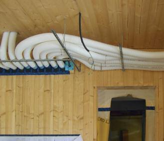 Qui a lato, canalizzazioni di VMC prima del rivestimento definitivo. Nella pagina a fianco, materiale certificato PHI per il retrofitting energetico (Foto di G Bollini)