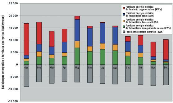 Concetto energetico basato su una fornitura di tipo ibrido rapportato al fabbisogno mensile In questo modo è ben visibile, per ogni mese dell’anno, quale fonte energetica è maggiormente in funzione per coprire il fabbisogno dell’edificio.