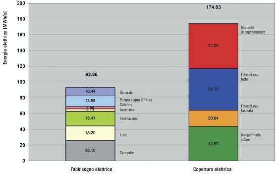 Prestazioni di picco del fotovoltaico: ca 151 kW totali (31,7 kWp in facciata, 58,7 kWp sul tetto, 60,75 kWp con gli impianti a inseguimento)