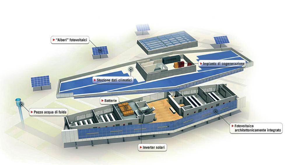 Un sistema di accumulatori ad alte prestazioni provvede a stoccare l’eccedenza in maniera da poterla riutilizzare al momento opportuno Alle batterie sono collegati 12 inverter che in pratica gestiscono e ottimizzano la rete elettrica dell’edificio