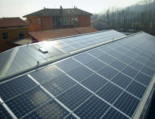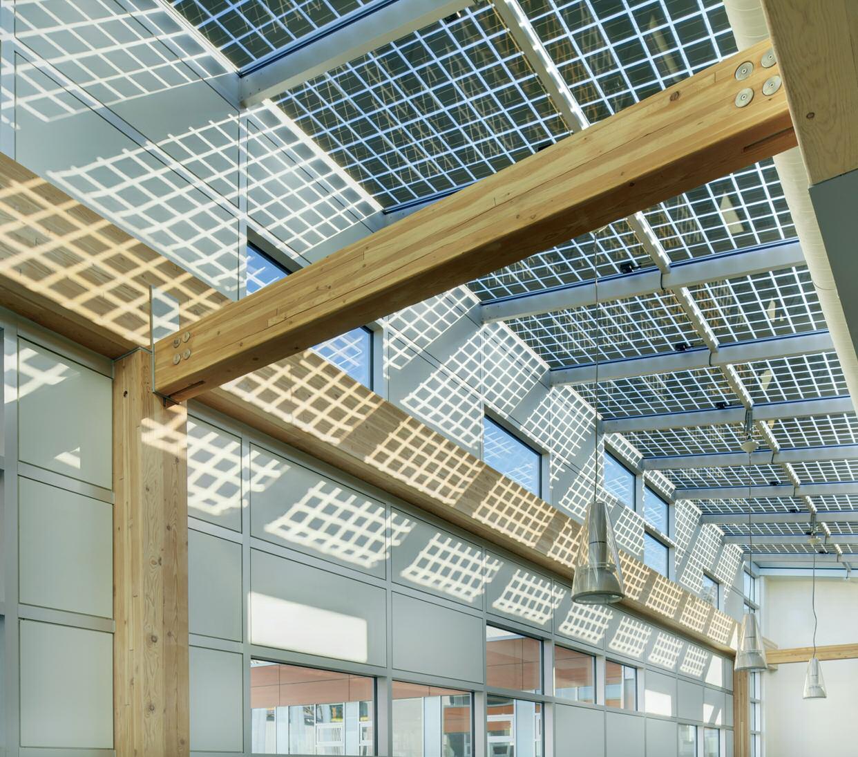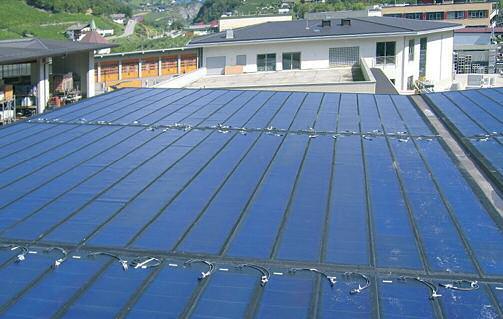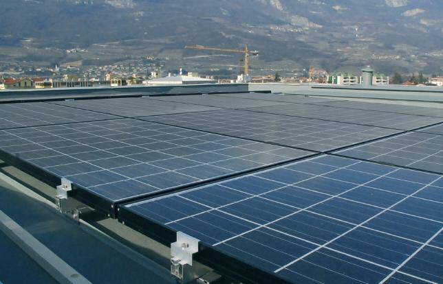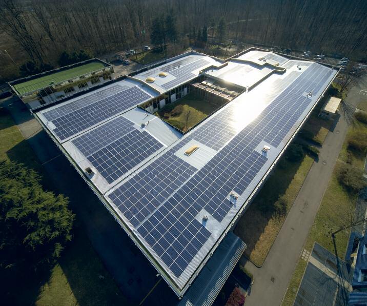 L’impianto FV collocato sul tetto, con moduli monocristallini ad alta efficienza, è a elevate prestazioni; tale tipo di moduli è stato scelto appositamente per la copertura, perché adatto alla conversione della radiazione solare diretta in energia elettrica Sulla facciata sono utilizzati, invece, moduli sottili amorfi, più adatti per l’irraggiamento diffuso, come avviene appunto in facciata Una parte dell’energia elettrica prodotta dal fotovoltaico è utilizzata per far funzionare la pompa di calore aria-acqua, che produce calore dall’aria esterna anche in caso di basse temperatura Il calore viene distribuito attraverso il sistema di ventilazione meccanica controllata e un impianto di riscaldamento a pavimento